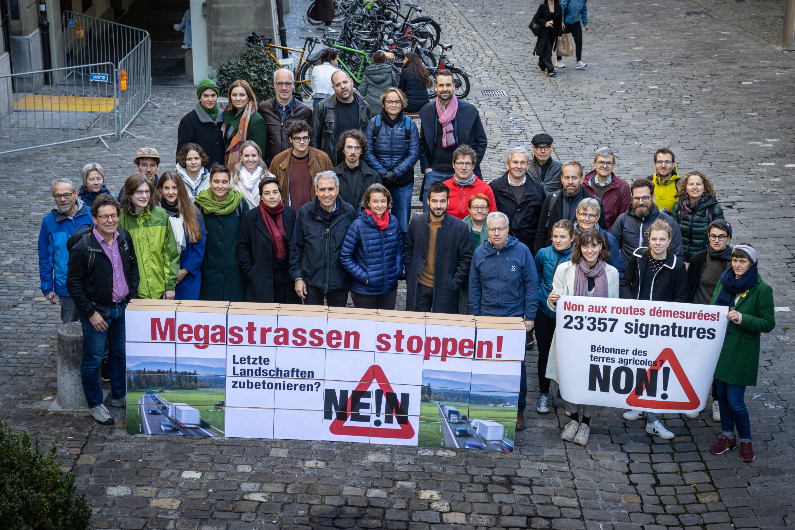 Le 7 novembre 2022, une large alliance de partis politiques et d’organisations de protection de l’environnement a déposé 23 357 signatures valides et attestées contre les projets de routes démesurées prévus en Haute-Argovie et dans l’Emmental. La population bernoise pourra s’exprimer sur la réalisation de ces projets coûteux et néfastes pour l’environnement à l’occasion d’un scrutin qui se tiendra vraisemblablement le 12 mars prochain. En plus d’attirer davantage de véhicules, de nuire à la biodiversité et de détruire des terrains précieux pour le secteur agricole, les aménagements annoncés augmenteront la capacité du réseau routier, ce qui est en totale contradiction avec la Constitution bernoise et les objectifs climatiques.
