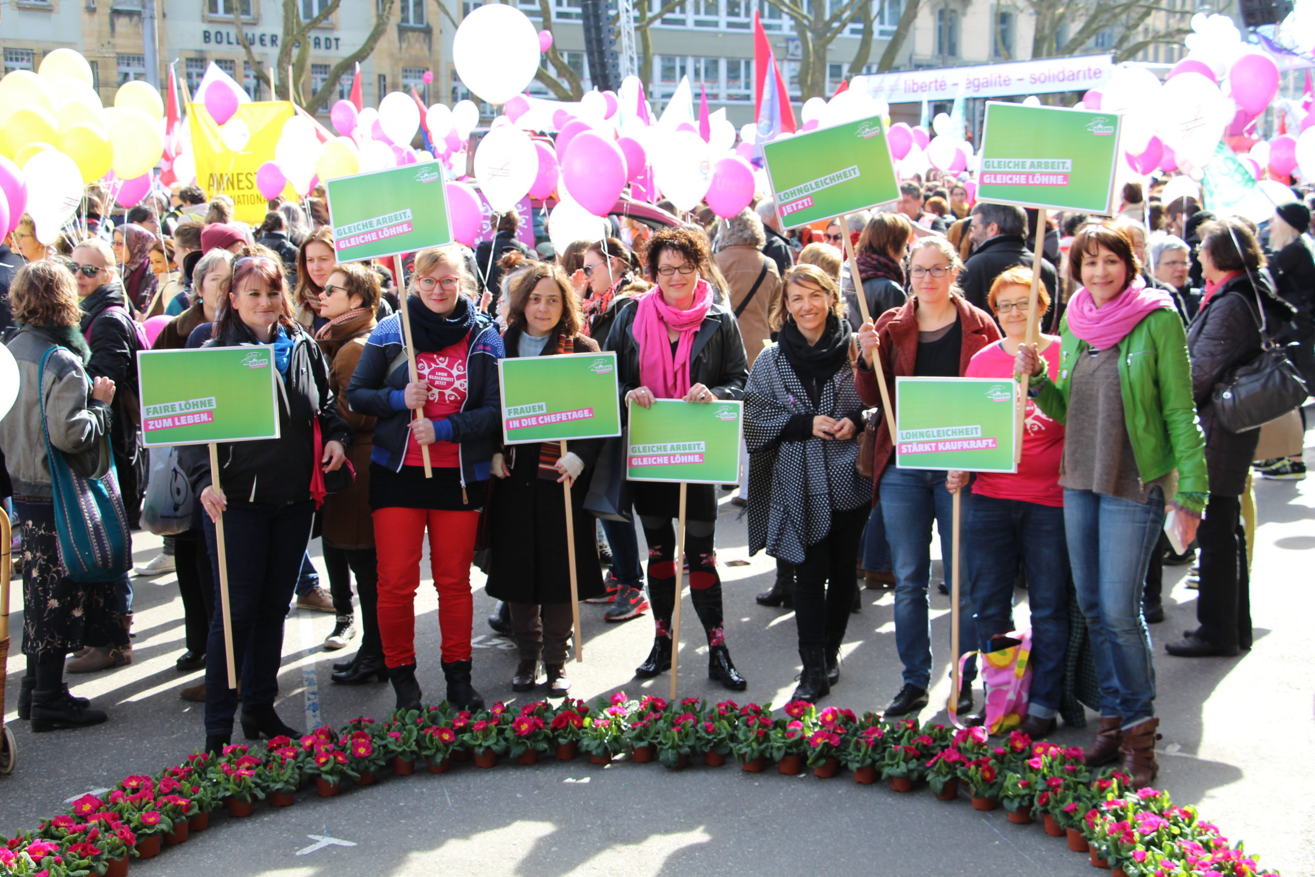 Als Symbol für ihren Einsatz für die Gleichstellung und gegen Lohndiskriminierung haben die Nationalratskandidatinnen der Grünen an der heutigen Kundgebung für Lohngleichheit pinkfarbene Primeln verteilt. Die Grünen werden sich auf nationaler und kantonaler Ebene weiterhin für Lohngleichheit einsetzen.